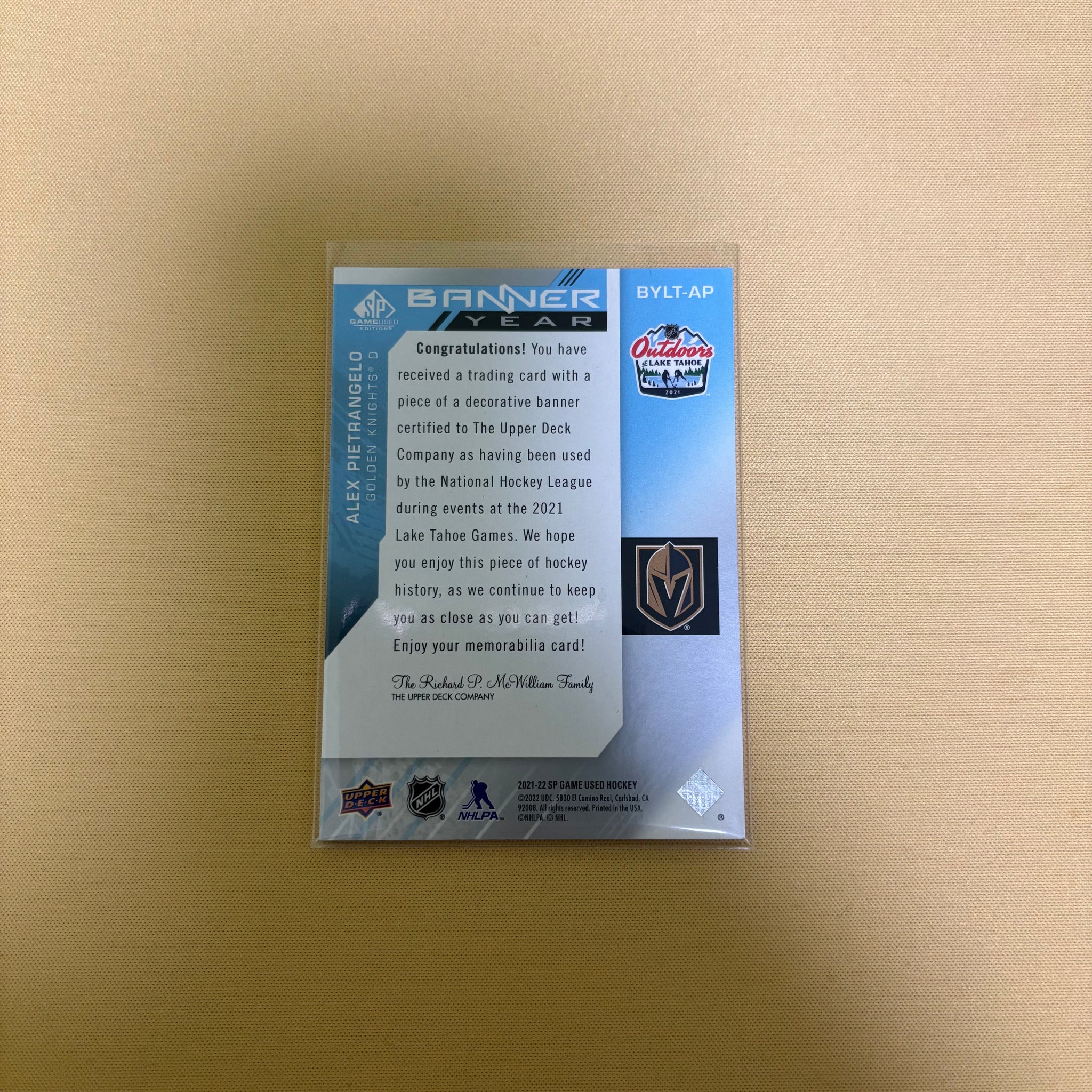 2021/22 Upper Deck SP Game Used Alex Pietrangelo Banner Year Lake Tahoe Vegas Golden Knights BYLT-AP Sports Card